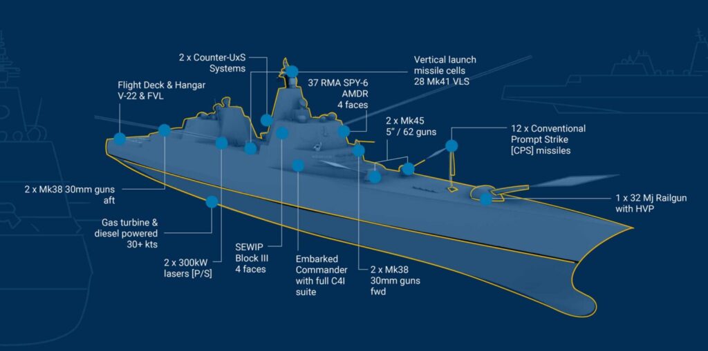 新艦艇將採用與目前柏克級Flight III型飛彈驅逐艦相同的作戰系統和武器,包括AN/SPY-6主動相位陣列雷達,128組單元的MK-41垂直發射系統,12枚傳統長程極音速飛彈以及5吋艦砲等,另外也預留加裝其他武器的冗餘如導能武器、核彈海基巡弋飛彈甚至可能有32兆焦耳的電磁軌道砲。主機系統將採用燃氣渦輪機和柴油發動機結合驅動發電,為艦上的武器系統和感測器供電。航速可超過30節,飛行甲板和機庫可容納V-22傾轉旋翼機以及下一代垂直起降飛機。根據戰艦的尺寸和所包含的系統,在美國造船廠建造這艘戰艦的成本估計可能在100億至150億美元之間。