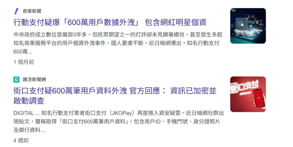 街口支付(JKOPay)曾多次捲入風暴,早前暗網社群出現貼文,聲稱取得「街口支付600萬筆用戶資料」,包含用戶ID、手機門號、身分證照片及銀行資料等機敏資訊,涉及多位網紅與藝人個資,內容包含多張疑似用戶身分證影像。部分網友質疑,若情況屬實,恐成台灣近年最大規模的行動支付資料外洩事件之一。